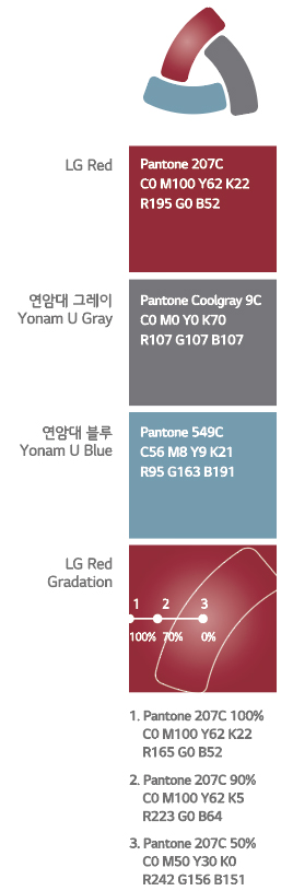 - LG Red 그라데이션은 무한하게 변화되는 세계로의 대응을 Yonam U Gray는 세계로 나아가는 연암공과대학교의 젊은 인재들을 Yonam U Blue는 현장중심의 실무교육을 담았습니다.